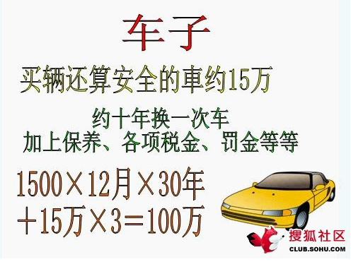 车子:90万。按10年换一辆12万的车计算,含30年汽车使用费。
