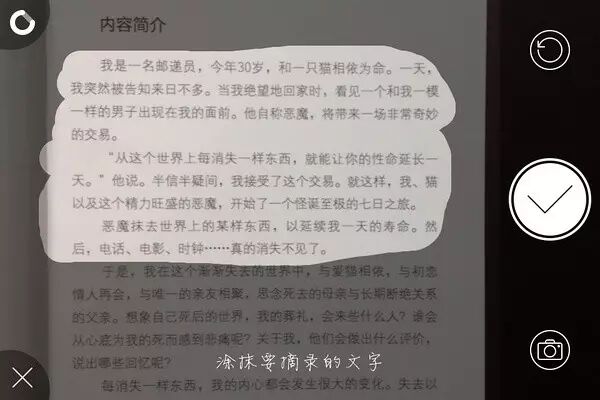 这款app功能十分强悍,特别适合喜欢读纸质书的人记笔记。它能非常快地将拍摄到的书上的文字进行电子化,而且可以涂抹你想要电子化的文字。为了让大家有一个形象的认识,我来演示一下这个工具的使用: