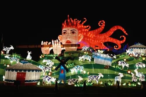 最年味 十二生肖灯组当之无愧的成为今年最具年味的灯组,同时也是跨度最长的灯组,其中以羊造型的灯组为首庆祝羊年的到来也可看做领头羊,以鲜艳的红色作为主色调更加烘托了过年的气氛。