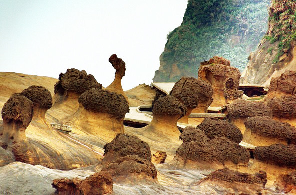 野柳系一突出海面的岬角,长约1700公尺,因波浪侵蚀、岩石风化及地壳运动等作用,造就了海蚀洞沟、烛状石、蕈状岩、豆腐石、蜂窝石、壶穴、溶蚀盘等各种奇特景观。女王头、仙女鞋、烛台石等,更是闻名中外的海蚀奇观。区内的林添桢塑像是纪念其当年舍身救人的英勇精神,纪念碑上详述了这则感人的故事。野柳的海洋世界,是国内第一座海洋动物表演馆,有生动活泼的海豚、海狮等动物表演,赏心悦目的高空跳水及水上芭蕾,还有约百公尺长的?海底隧道?可欣赏各种珍奇鱼锼。烛台石的‘烛火’其实是岩层里坚硬的球形结核,因较能抵抗海蚀,而露出锥形顶部,海水沿其边缘回流激荡,产生环状沟槽,由于结核外围有一带坚硬的环圈,海水便顺此环圈向下侵蚀、切割,形成圆锥状外形