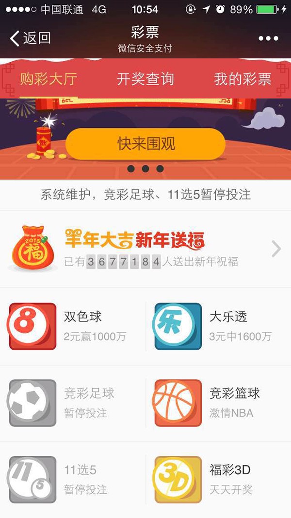 同样有卖彩票的微信,竞彩足球、11选5也已经暂停投注,其他双色球、大乐透等彩种目前还正常销售,官方表示是因为系统维护。