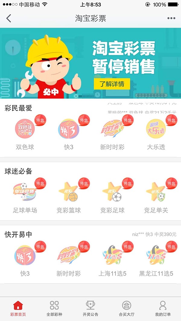 今日(28日)凌晨5时许,淘宝彩票官方微博发布公告称,将从今日5:00起陆续暂停所有彩种的销售,已下单的成功的订单将会正常兑奖。淘宝方面并未说明恢复时间。