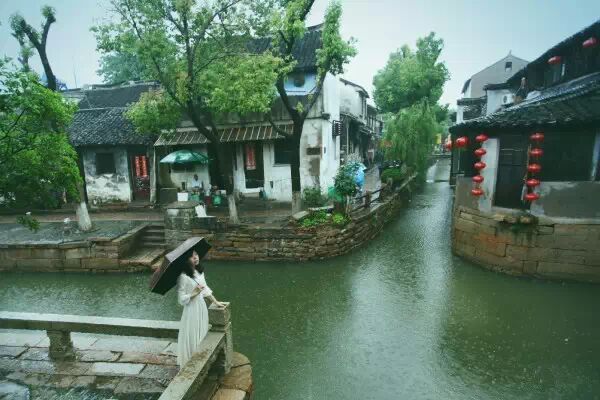 水乡下雨了,我在拍风景的时候想自己出现在岸边会很好看,就把相机放在桥上,然后跑下去拍。