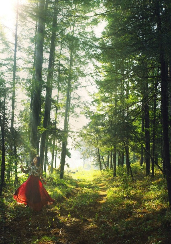 清晨起了大早背着脚架到森林去自拍,阳光迷人,光线透过红裙子产生美好的剪影,让我可以假装成为林子里的女巫,在小道上跑来跑去,相机咔咔记录,像情人的眼(嗯,我的情人是个独眼龙。)用三脚架还有一个好处是可以让相机竖起来拍,得到更有纵深感的构图。