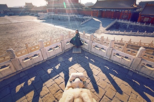 在去一个隆重的地方(皇帝召见当然隆重)不知道穿什么的时候,我就会穿上大裙摆,这样气场不会输给大场景,而且动作上只需要在镜头前把裙子摆来摆去就可以了。这张照片是放在上面的龙头拍的,跑了好久……