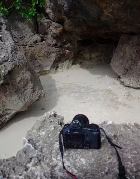 海边的礁石拥有特别的质感,几块大礁石的层次令人着迷,我把相机放在石头上,用纸巾和手机把镜头垫高,然后把自己放到画面中去。那时闷热得快要下雨了,慌忙地拍了一张就走,后来还真的下起了太阳雨。