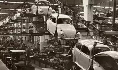 上图是大众汽车1969年的生产流水线,自动化程度比现今国内很多车厂的自动化程度都高。生产流程化的核心目的就是把生产过程切分成非常细小的片段,每个片段都遵循严格的顺序加工,片段之间用自动化的传动装置连接起来,每个片段简单到不需要人工操作的时候,就被机器取代了。