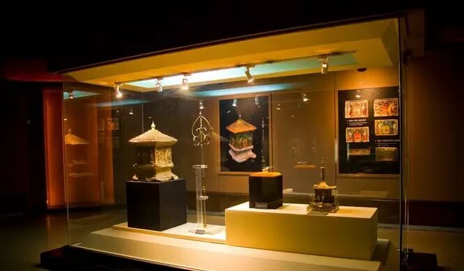 珍宝馆(也称博物馆)内,展出了地宫出土的文物精品。你能够观赏到唐皇室供佛的上百件珍宝,件件都让人为之惊叹。其中有:安放舍利的八重宝函、十二环锡杖、纯金塔、汉白玉灵帐、秘色瓷、皇帝使用的茶具等等。这些珍宝有的是用纯金打造,有些珍宝的制作工艺已经失传,有的是全世界仅有的,体现了当时唐帝国的极度富有和皇室礼佛的一片诚心。
