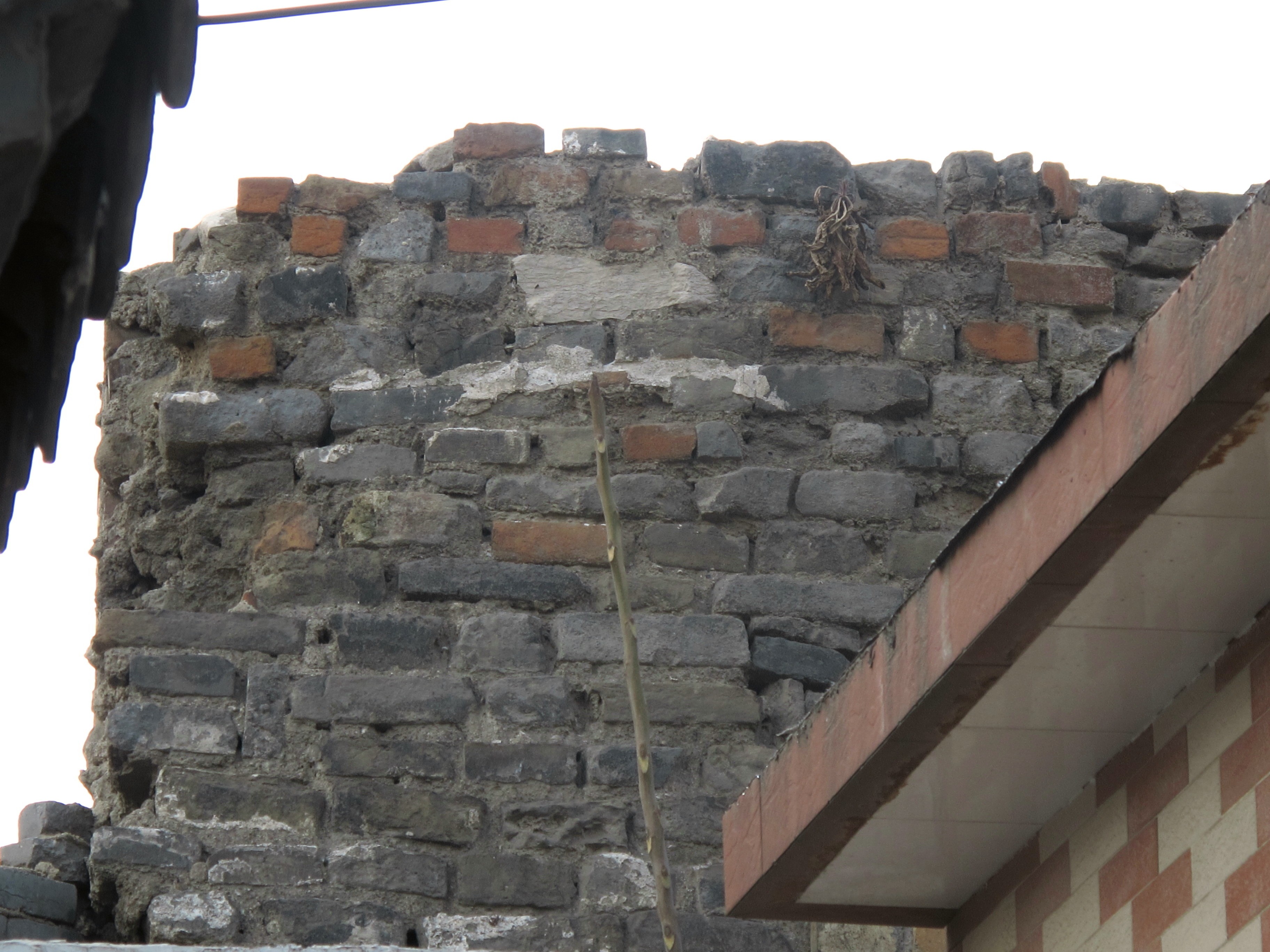 找这段古城墙并不容易,从熙熙攘攘的泉城路沿鞭指巷往北,到将军庙街后往西,经过慈云观和将军庙街天主教堂,再往西,就是南北向的西墙根街。但是从南往北走完整条街,记者也没有发现老城墙。问了两个人,才知道原来紧靠这段残存的古城墙以西,已经建起了一间公共厕所。城墙的大部分已经被沿街而建的公共厕所遮挡,只能在厕所南侧空隙抬头往西看,才看得到残存城墙的一角,看得到的这城墙一角,高约三米,古砖斑驳,守望岁月沧桑。