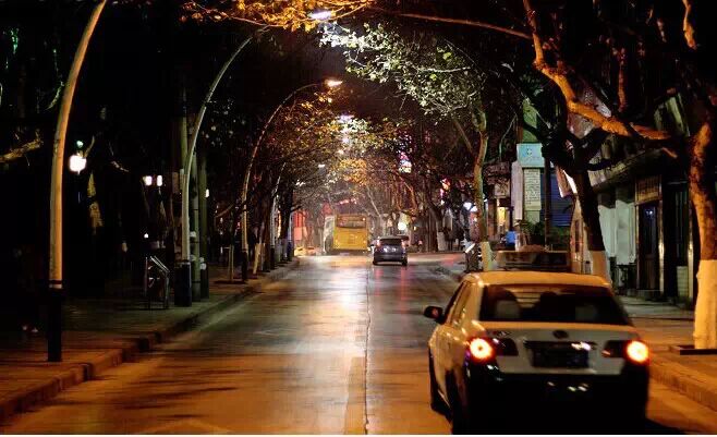 街道像一条波平如静的河流,蜿蜒在浓密的树影里,只有那些因风雨沙沙作响的树叶,似在回忆着白天的热闹和繁忙。