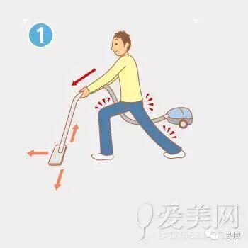 ①双手拿着吸尘器,左脚向前迈出一步,膝盖弯曲成直角,手尽量往远处伸。后脚伸直,脚后跟紧贴地板,拉伸小腿肚的肌肉。