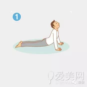 ①身体趴下,双手打开与肩齐宽。下半身与地板紧贴,双手支撑地板,轻轻撑起上半身,拉伸胸部到腹部的肌肉。
