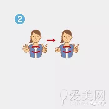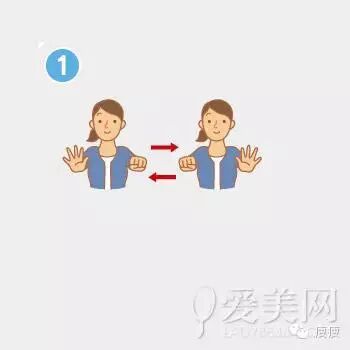 ①双手手腕向前伸直,举到胸前的高度,右手做“布”的姿势,左手做“石头”的姿势。双手交换做同样的姿势。