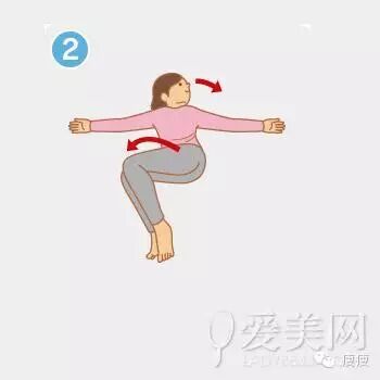 ②在①动作的基础上,倾斜身体,往后方扭转,拉伸腹部的肌肉。不要勉强,慢慢做比较好。