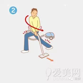 ②右脚向前迈出一步做同样的动作。重心放低,把吸尘器向左右摆动。