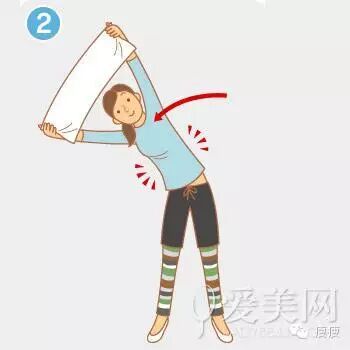 ②继续左右拉着毛巾,上半身分别向左侧、右侧倾倒,拉伸腹部肌肉。