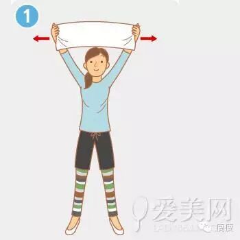 ①把毛巾尽量举高在头顶,挺胸收腹,用力把毛巾向左右拉扯。