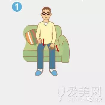 ①坐在椅子上,双手放在大腿上。右手握拳敲打大腿,左手前后摩擦大腿。