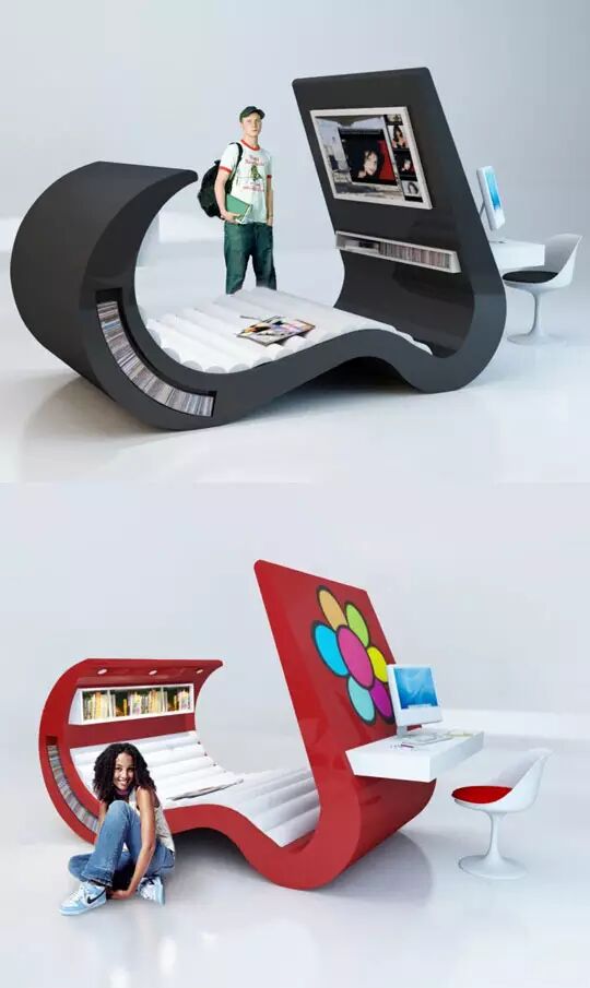 想躺在床上舒服地看大片?没问题,下面这款现代波浪形床可以满足你。它分男女款,而且还附带电脑桌功能。
