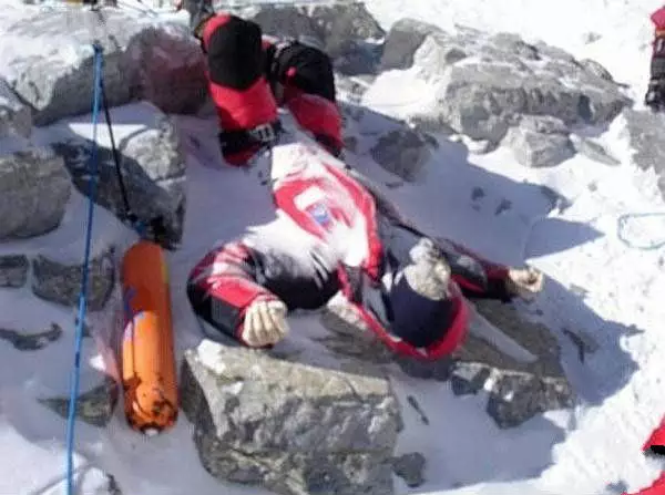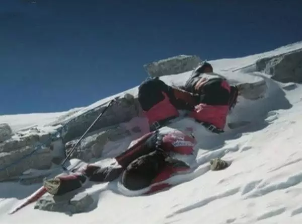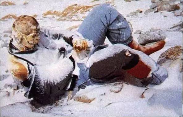 这是一名死亡的女性,美国女登山家弗朗西丝?阿森蒂夫。在临死前她身体变得越来越冰凉,出现了各种幻觉,开始失去意识。情况变得极其糟糕,她的两名同伴只能离弃她而去。在这种情况下,这是唯一的选择。直到今日,她的那两名同伴依然记得当时她的歇斯底里的叫喊:Please don`t leave me!他们内疚,可是他们别无它选...