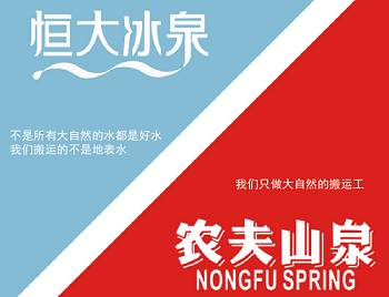 (图:恒大冰泉、农夫山泉)从“农夫山泉有点甜”到“我们只做大自然的搬运工”,农夫山泉经历了一次蜕变,整个企业也有开始迈出新的一步。恒大冰泉在推出时期借势农夫山泉的影响力,将宣传语定为“我们搬运的不是地表水”。没错,听起来很耳熟,加上搬运工的淳朴形象,农夫山泉和恒大冰泉都展示了一副秀丽山川的画卷和淳朴人民的肖像图。