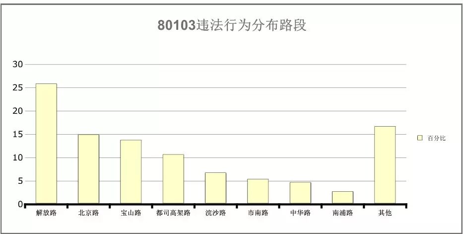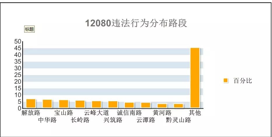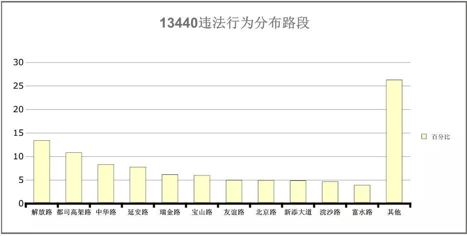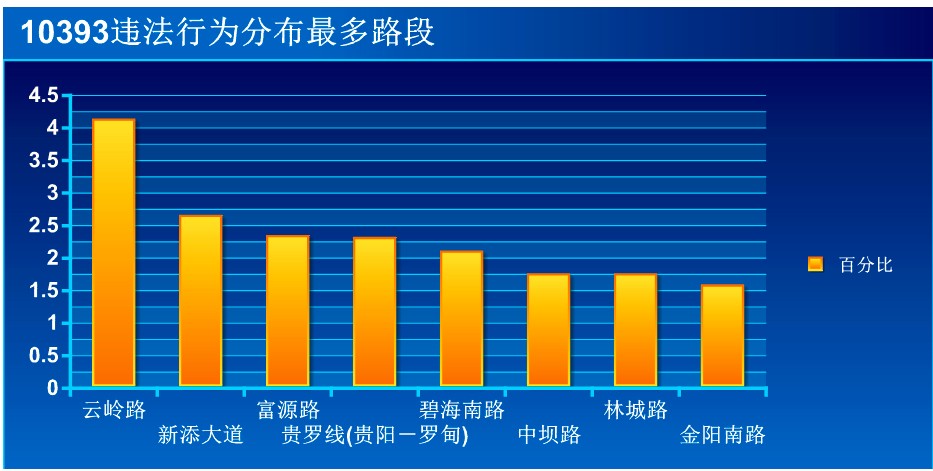 10393违法行为全市比较平均,最多的几条路段仅仅占比18.53%,可以看出违法停车是所有路段管辖部门的查纠项目。