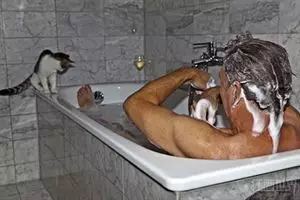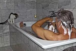 2. 现在进行时He is drinking wine in a bathtub(while the cat is watching him washing his hair).他正躺在浴缸里喝着葡萄酒,而喵星人在一旁看着他洗头。