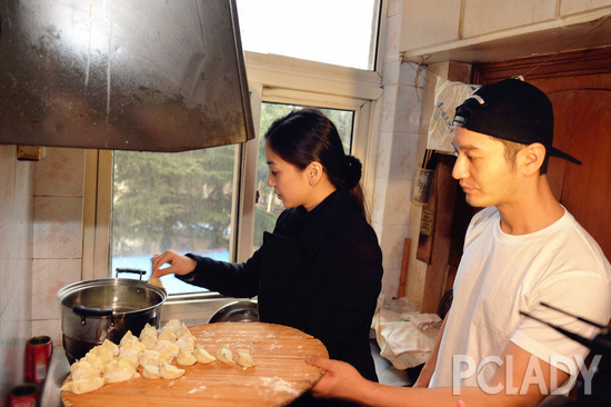 穿着灰色休闲装的黄晓明和穿着开衫的Baby在家一起包饺子,享受浓浓的团圆时刻。