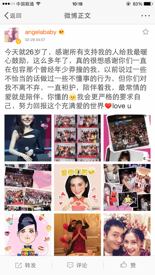 2月28日是Angelababy26岁的生日,凌晨4时许,Baby更新微博写道“今天就26岁了,感谢所有支持我的人给我最暖心鼓励,这么多年了,真的很想感谢你们一直在包容那个曾经年少莽撞的我,以前说过一些不恰当的话做过一些不懂事的行为,但你们对我不离不弃,一直袒护,陪伴着我,最常情的爱就是陪伴,你懂的,我会更严格的要求自己,努力回报这个充满爱的世界,love u”。Baby还上传了一组这几年庆生的照片,其中有两张是她和黄晓明的合影。