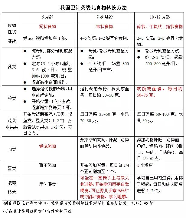 卫办妇社发〔2012〕49号文件中,给出了《儿童喂养与营养指导技术规范》,这是下发各地卫生部门执行的文件。换言之,我们带宝宝去参加的儿保,是应当照此指导宝宝的辅食添加的!!!