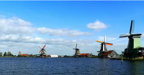 荷兰,桑斯安斯风车村。从阿姆斯特丹往北15公里,便可看到风车朝气蓬勃地转动着 。