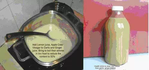2.将蒜头、姜汁放入瓦煲,加入柠檬汁与苹果醋,大火滚,小火慢煮,不要盖锅盖,让水份蒸发,大约需要半小时,剩下大约一半汁液。