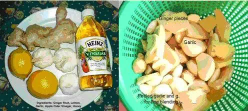 1.蒜头去皮,姜去皮切小片,放入榨汁机榨汁,或者放入搅拌器打成浆,用网布隔渣,绞出汁。