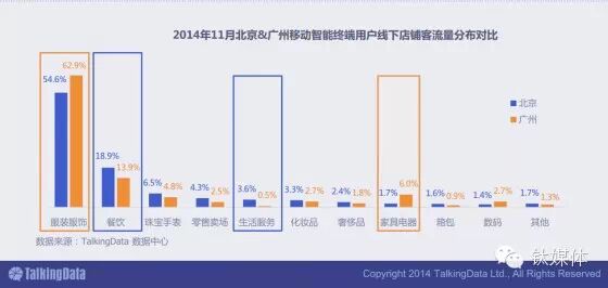 得益于发达的服装批发业,广州用户的服装服饰类消费力高于北京8.3个百分点,而北京作为各路美食聚集地,吸引了18.9%的客流;此外,北京人爱外出就餐、享受生活服务,广州人更注重服饰、也更居家