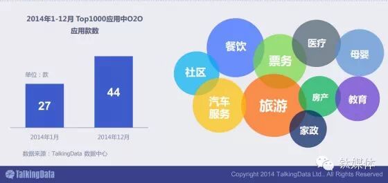 这尤其表现在O2O领域,去年1月―12月,在TOP1000应用中,1月份只有27款关于O2O的应用,但是到12月底,已经有44款,基本上接近于翻倍的增长,比较广泛的分布在餐饮、票务、汽车、旅游以及等等一系列的生活服务。