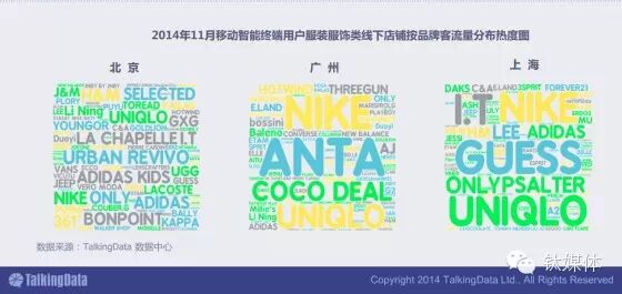 广州用户的运动户外类店铺客流量占服装服饰类整体客流的60%,而上海的潮流女装和牛仔休闲类客流量接近6成,可以看出,广州人爱运动,上海人爱时尚、更休闲。