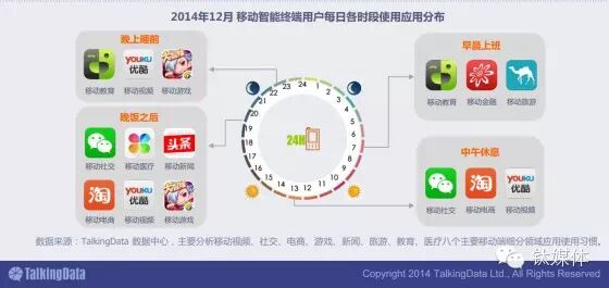 基于TalkingData的统计,去掉系统自带的安装应用,用户平均来讲,一台终端设备会有34款应用,而每天打开20款应用。这能够反映出,移动端的入口是广泛分布的,不在一两家身上。