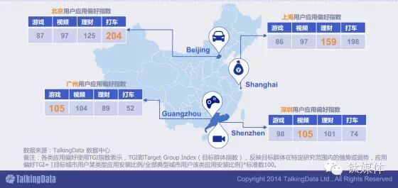 一线城市用户的应用喜好呈不同特征:北京爱打车,上海偏理财,广州爱玩游戏