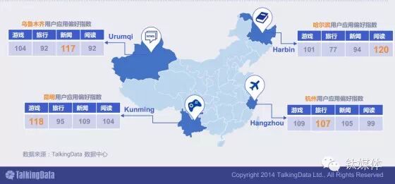 各典型城市用户的应用偏好差异化明显,乌鲁木齐用户更关注新闻、哈尔滨用户喜欢阅读、昆明用户爱玩游戏、杭州用户更爱旅行。
