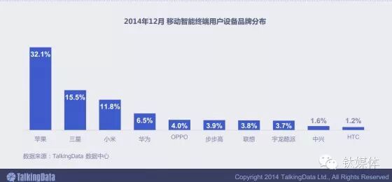 用户使用的移动设备中,苹果占据32.1%的最大份额,其次,三星设备占15.5%,小米设备占11.8%。