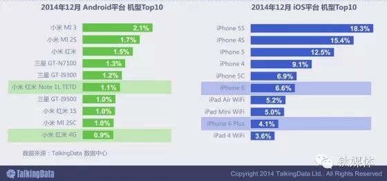 安卓平台主要机型以小米与三星占据主流,iOS平台iPhone6代新机型占比已超10%。