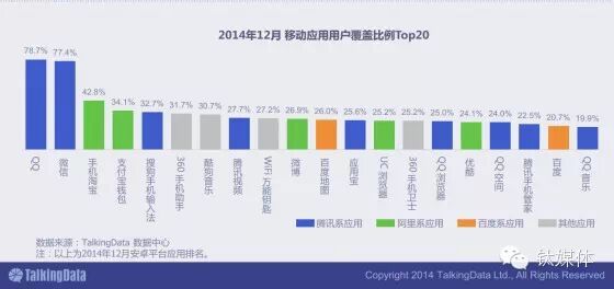 应用覆盖率Top20:腾讯系占九席,阿里系五个上榜,百度系只有两个
