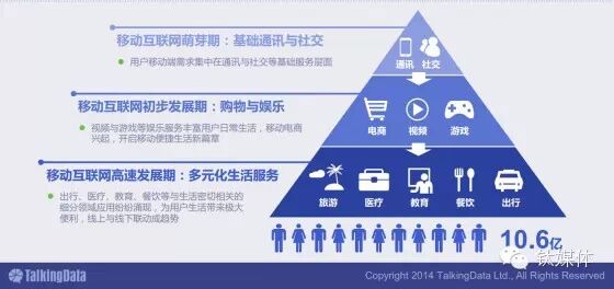 总结来看,移动互联网萌芽期主要是基础通讯和社交,最开始是像QQ、微信这样的应用先火起来,其次就是像视频、游戏和电商类有强烈应用的软件火起来了。但是从2014年开始,很多关于生活类的应用,才能真正发展和火起来了,包括旅游、医疗、教育、餐饮和出行,这些跟生活息息相关的应用,在2014年充分得到了发展。