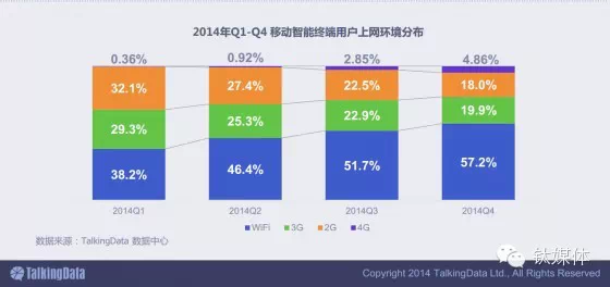 用户的上网环境明显改善,从年初1/3的使用率到年尾一半以上的日常环境都会是Wi-Fi的使用,这就是说大家的上网环境更好了,同时我们看到2G、3G的比例在缩小,4G用户增长较快。