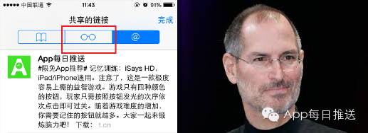 就是那个图标很像指南针的自带浏览器。这个彩蛋隐藏的很深哇,自带浏览器Safari的阅读列表的“眼镜”图标居然是乔帮主的眼镜。