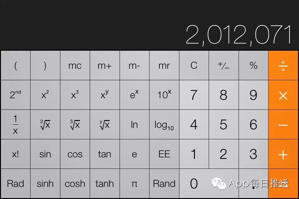 一开始还觉得自带计算器的运算功能太少了?把iPhone横屏过来你就被吓坏!运算功能非常的全面!开n次方根,指数幂,三角函数等等运算都有!分分钟赶上当年的卡西欧!