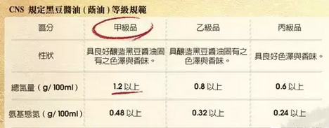 1. 成分:酱油的等级区分标淮在于总氮量,依照 CNS 423 中规定,黑豆酱油甲级品中总氮含量标淮为每 100 毫升 1.2 克,乙级品为 0.8 克,丙级品为 0.5 克,而日式酱油的甲级标淮为 1.5 克,顶级的黑豆酱油在业界的标淮必须高达 1.7 克以上,这些标淮除了反应出酱油的含量浓度,也比较出商家的后制作技术,来保留出最高的总氮量(如下表)。