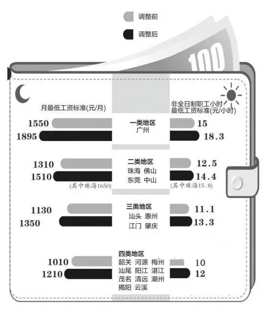 第二类标准为1510元/月,执行地区为珠海、佛山、东莞、中山市,对应的非全日制职工小时最低工资标准为14.4元/小时,其中珠海在此标准的基础上上调到1650元/月、15.8元/小时;第三类标准为1350元/月,执行地区为汕头、惠州、江门、肇庆市,对应的非全日制职工小时最低工资标准为13.3元/小时;第四类标准1210元/月,执行地区为韶关、河源、梅州等十一市,对应的非全日制职工小时最低工资标准为12元/小时。
