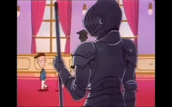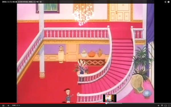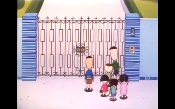 截了几张小丸子第一次去花轮家玩儿的图。他们集体去花轮家参观,70 年代的小孩第一次看到闭路电视门禁(右边栏杆):