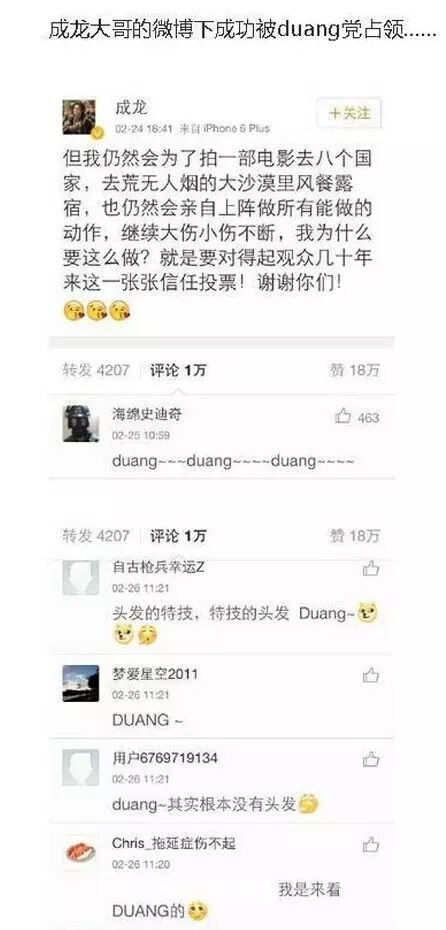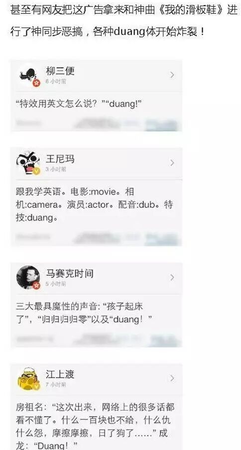 近日,成龙再因之前的广告代言被网友恶搞。2004年成龙代言某洗发水,一句“拍这洗头水广告的时候,其实我是拒绝的”曾引发一场热议。而近日,这则被“打假”的广告再被网友挖出来恶搞。而这次恶搞更显“高大上”,与当前热门的庞麦郎的《我的滑板鞋》神同步,其中的一句“Duang”更在一夜之间成了热门词语。